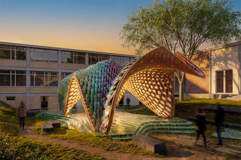 Designed by ggstudio for World Design Capital Frankfurt 2026, this lightweight pavilion for the Cervantes Institute combines wood, ceramics, and textiles into a fully reversible, reusable cultural infrastructure. Reinterpreting the architectural methods of Antoni Gaudí through an organic and continuous geometric form, the project demonstrates how temporary structures can activate public space without permanent construction — aligned with the principles of the New European Bauhaus. Source: Designboom