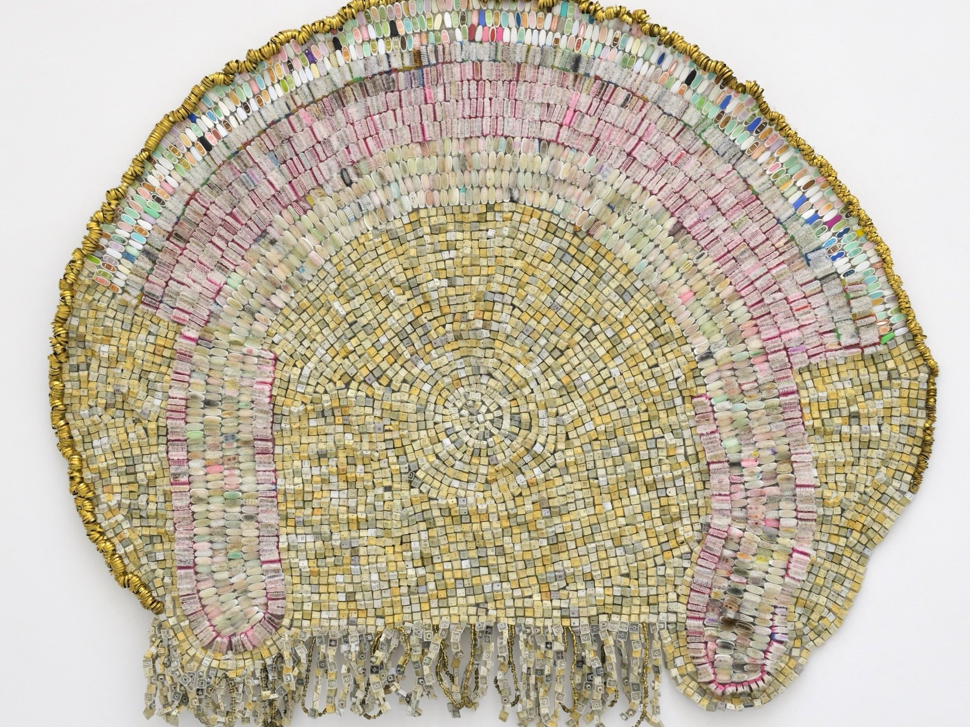Zimbabwean artist Moffat Takadiwa transforms thousands of discarded keyboard keys, toothbrush heads, and plastic combs foraged from landfills into elaborate sculptures that confront the cultural residue of colonialism. His solo exhibition “The Crown!” at Semiose gallery in Paris mines the tension between visual harmony, consumer culture, and post-colonial identity. Source: This Is Colossal