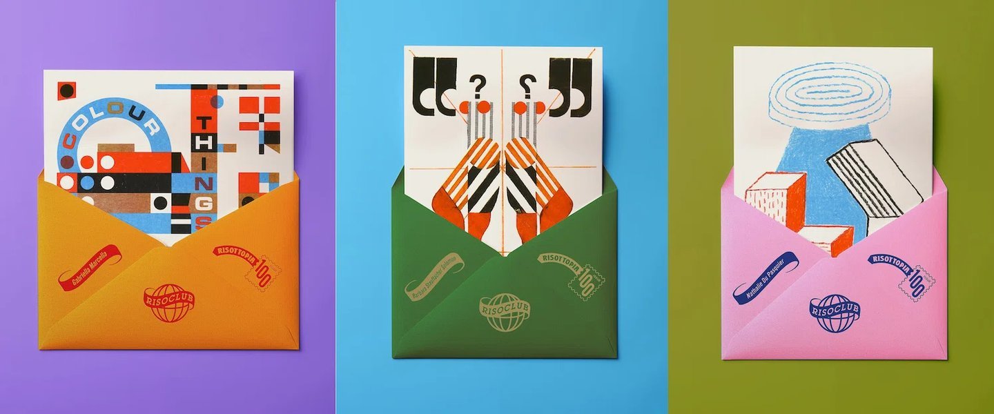 Glasgow-based print studio Risotto celebrates 100 months of its Riso Club — a monthly series of hand-printed artist postcards sent worldwide. The milestone is marked with a free retrospective exhibition at The Glue Factory Galleries, putting 400 prints by artists including Nathalie Du Pasquier, Peter Shire, and Barbara Stauffacher Solomon on show through 19 April 2026. Source: It’s Nice That